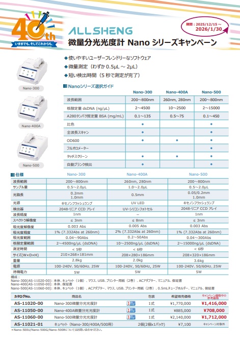 ALLSHENG 微量分光光度計 Nano シリーズ/フルオロメーターシリーズキャンペーン! -